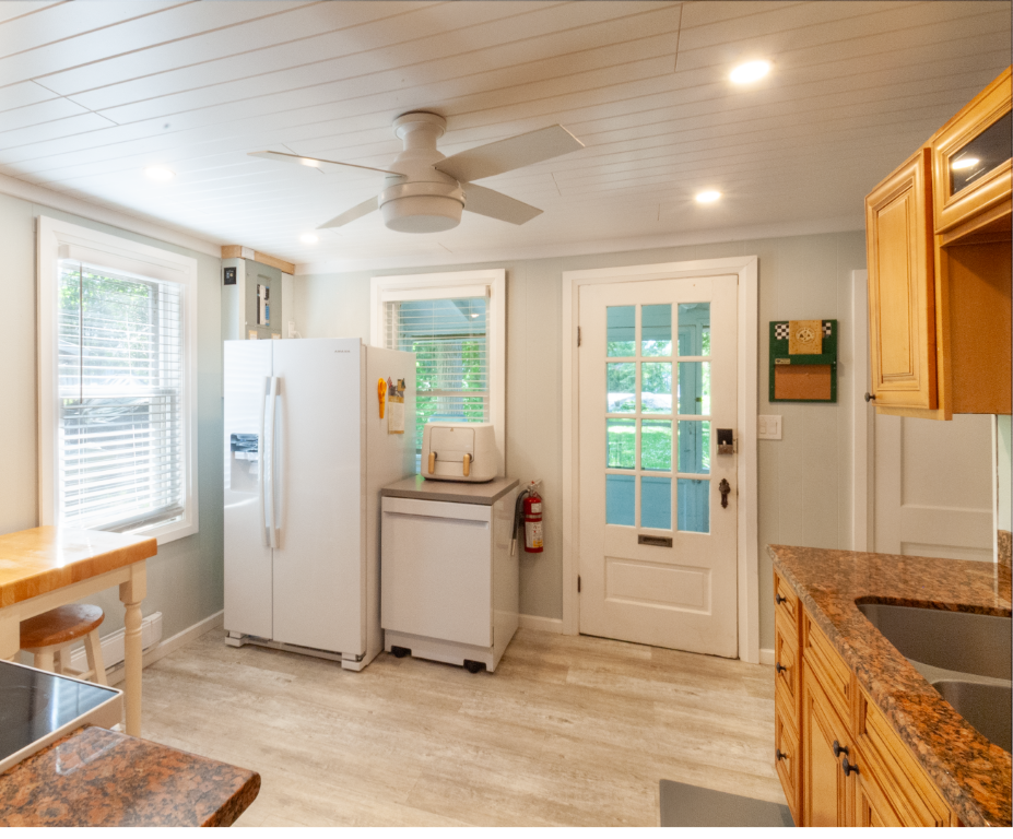 Air-conditioned and heated, three-piece bathroom, gas fireplace, full kitchen with pots, pans, tableware, cutlery, oven, range and dishwasher.